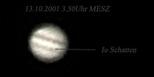 Der Gasriese hielt ein ganz besonders Schauspiel für mich bereit, das sämtliche Oberflächenmerkmale in den Hintergrund drängte. Die Mond Io und Europa zogen heue vor der Planetenscheibe entlang, und warfen ihre Schatten fast gleichzeitig auf die obere Wolkenschicht. Leider gelangte der Planet erst gegen 3 Uhr in mein Gesichtsfeld, als ein Schatten die Oberfläche schon wieder verlassen hatte! Die Mond Ganymed und Europa hielten sich weit ab in sicherer Entfernung von diesem Ereignis auf. 2 Hauptwolkenbänder und 2 schwächere waren ebenso zu erkennen.